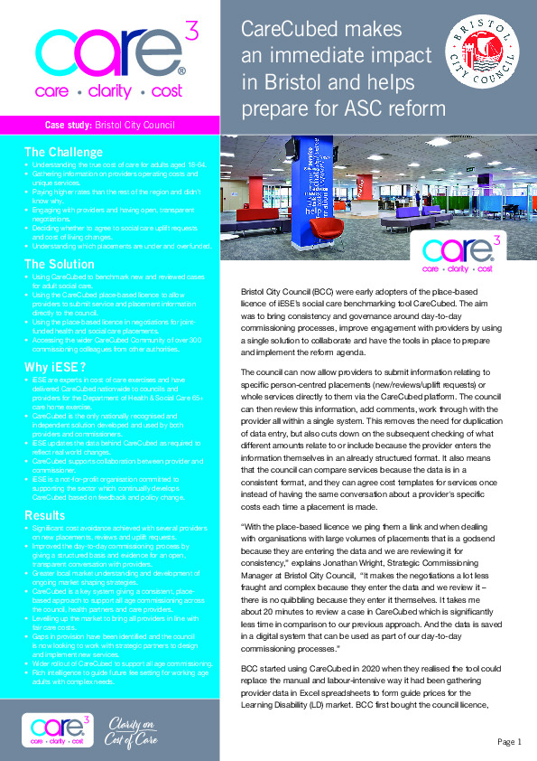 Bristol City Council (BCC) were early adopters of the place-based licence of iESE’s social care benchmarking tool CareCubed. The aim was to bring consistency and governance around day-to-day commissioning processes, improve engagement with providers by using a single solution to collaborate and have the tools in place to prepare and implement the reform agenda.